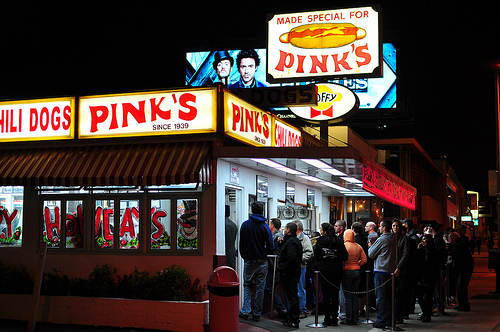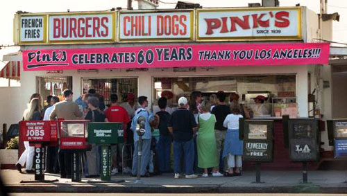 Pink’s esta ubicado en la esquina de La Brea y Melrose ave Esta abierto hasta las 2am (aprox)